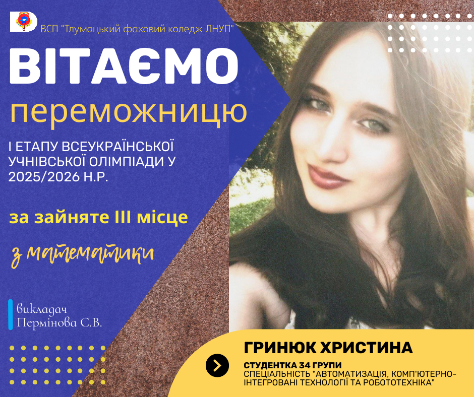 Щиро вітаємо переможницю І етапу Всеукраїнської учнівської олімпіади у 2025/2026 н.р. за зайняте ІІІ місце з Математики – Гринюк Хрстину (студентку 34 групи).