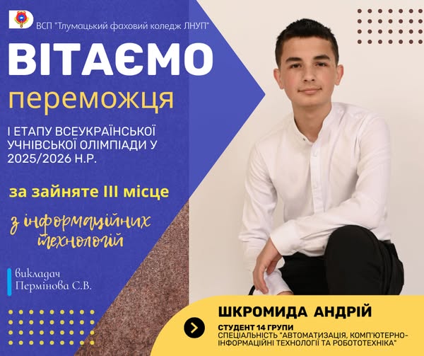 ІІІ місце з Інформаційних технологій – Шкромиду Андрія (студента 14 групи)