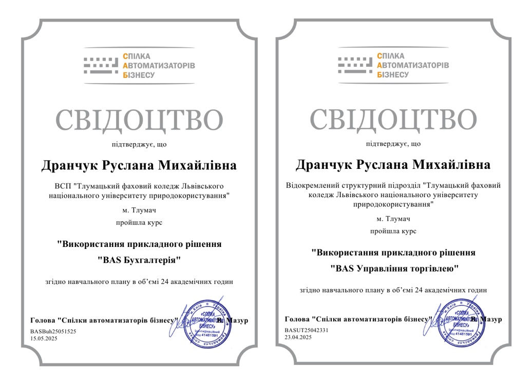 З 1 по 3 квітня 2025 року викладачі ВСП «Тлумацький фаховий коледж ЛНУП” – КРИЖАНІВСЬКА Любов (Liubov Kryzhanivska-Hirak), ДРАНЧУК Руслана та ДУДА Галина (Галя Дуда)– пройшли онлайн-курс для педагогічних працівників: «Використання прикладного рішення “BAS Комплексне управління підприємством”». Курс проходив відповідно до навчального плану у загальному обсязі 24 академічних годин.